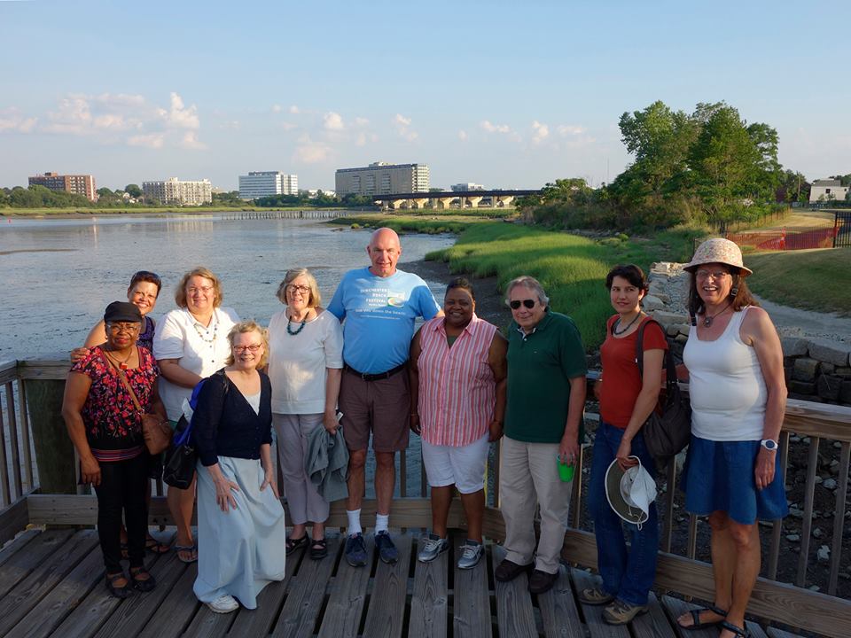 The Greenway Council took a walking tour around the park before the start of our July 6 meeting at the Port Norfolk Yacht Club. (Photo by Lee Toma)